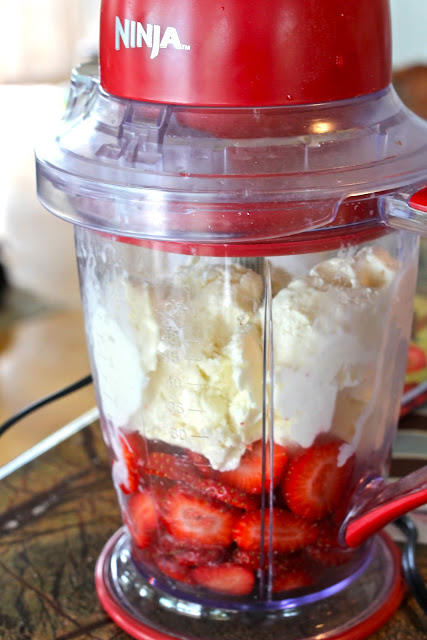 Beat in a blender. Add a little milk if necessary. My ice cream a little on the soft side so I didn't need any. Top with hot fudge and a strawberry.