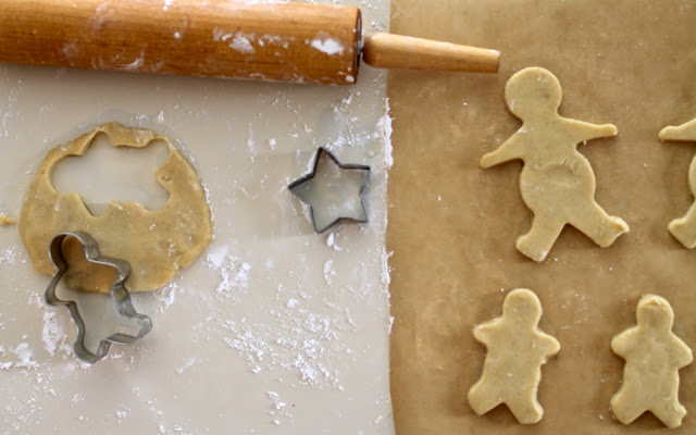 Roll out the dough on a clean surface that is thoroughly dusted in powdered sugar. Do not use flour. Cut into shapes and place on baking sheets covered in parchment paper. Freeze the sheets of unbaked cookies for about 7 minutes or until solid. Bake at 350ยบ for 8-11 minutes or until desired doneness is reached. Cool on wire rack.